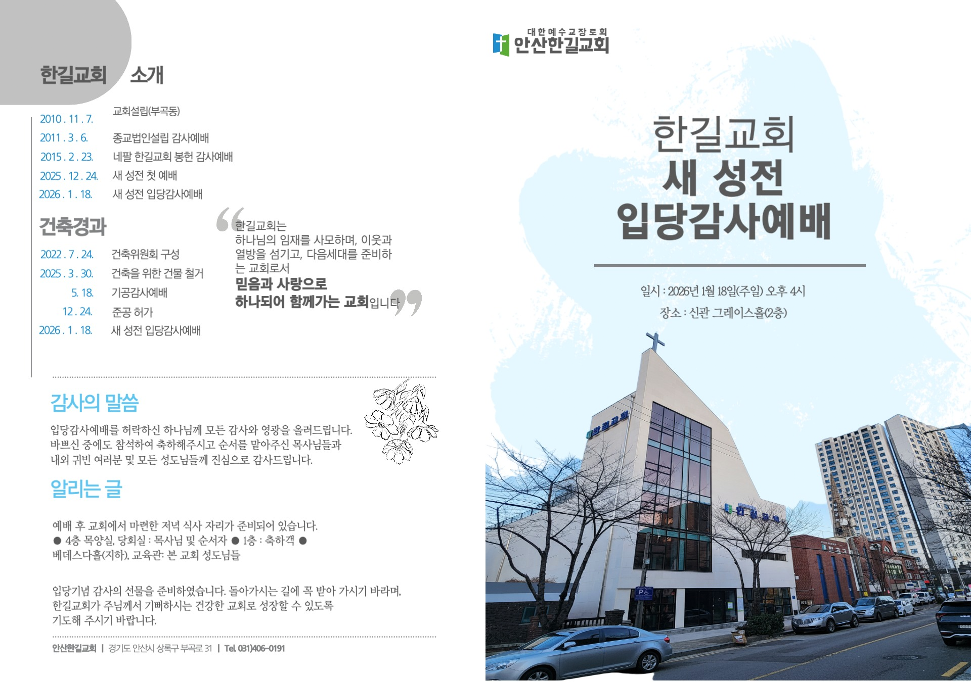 * 1월 18일 주일 오후예배는 교회 설립 15주년 기념 입당감사예배로 오후 4시에 드립니다.